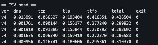 CSV는 `ver,dns,tcp,tls,ttfb,total,exit` 컬럼으로 저장