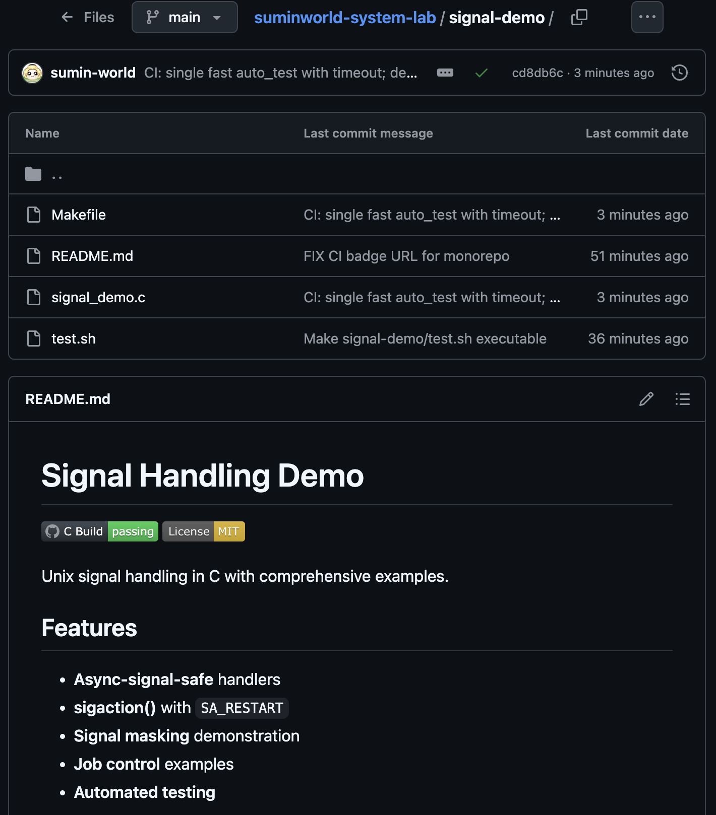 전체 코드: suminworld-system-lab/signal-demo suminworld-system-lab/signal-demo at main · sumin-world/suminworld-system-labSystem programming & networking lab (C, Linux, OSTEP practice) - sumin-world/suminworld-system-labgithub.com프로젝트 구성signal_demo.c는 다음 기능을 포함합니다:SIGINT/SIGTSTP 핸들링 (Ctrl+C, Ctrl+Z)SIGALRM 타이머 처리SIGUSR1/SIGUSR2 사용자 정의 시그널Job control 예제자동화 테스트 모드대화형 메뉴를 통해 각 기능을 실행하며 동작을 확인할 수 있습니다. ..